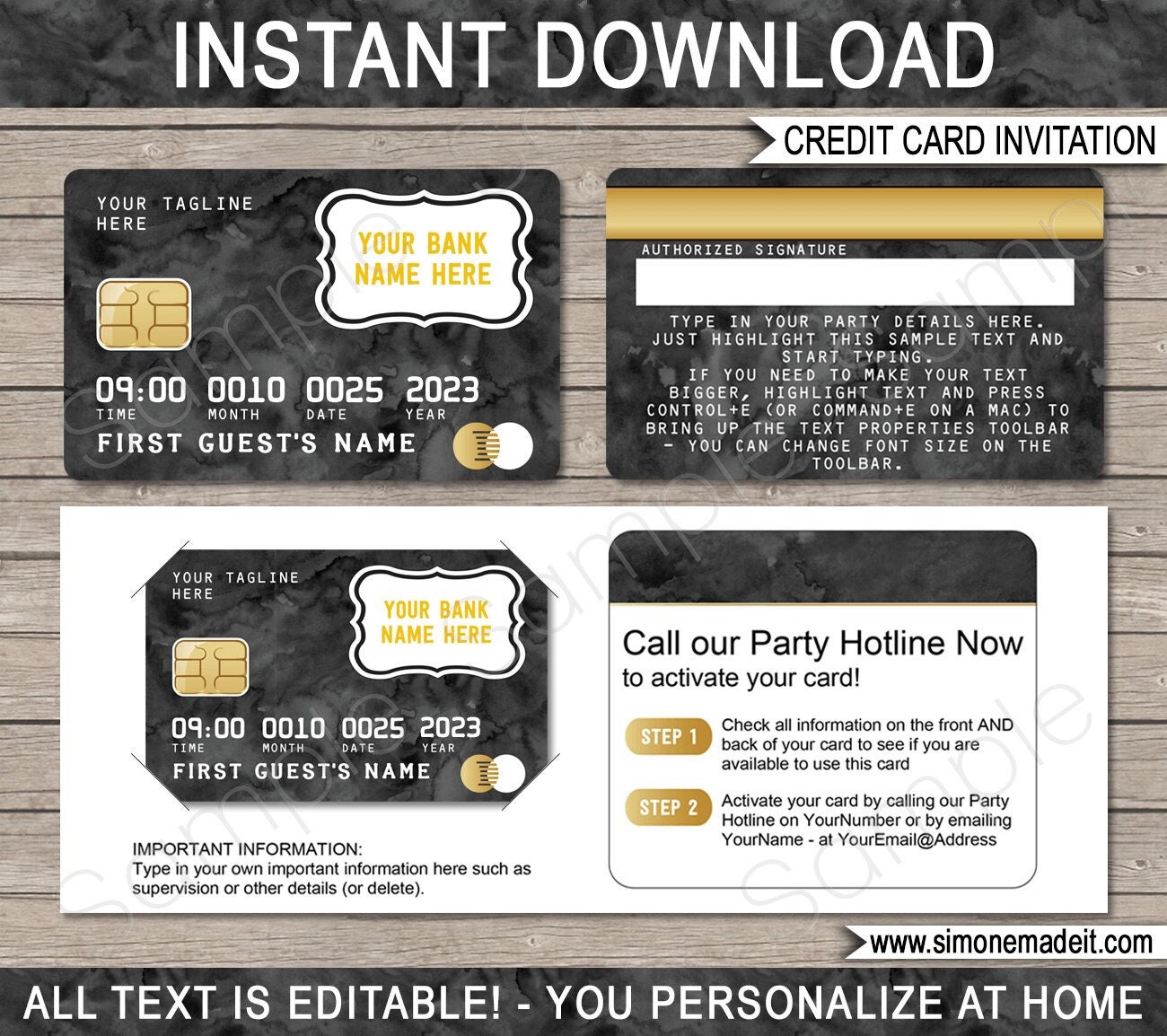 Credit Card Invitation Template Printable Birthday Party Etsy